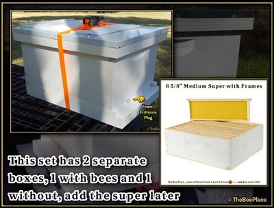 This set includes a 5-frame nucleus colony installed into a complete 10-frame Langstroth style deep brood box, plus one medium honey super for expansion and honey storage.